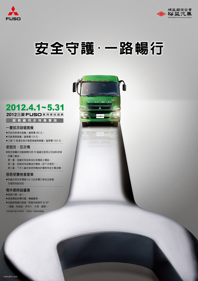 安全守護‧一路暢行!2012年三菱FUSO商用車巡迴展服務廠同步優惠實施!(2012年4月1日至5月31日止)