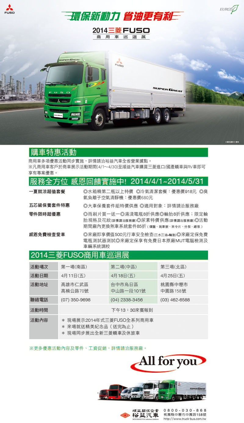 環保新動力,省油更有利!2014年三菱FUSO商用車巡迴展,竭誠歡迎您的蒞臨指導!(4/11南區-仁武、4/18中區-台中、4/25北區-中壢)