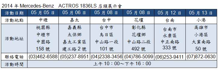 多一種選擇‧多一份滿意,2014年Mercedes-Benz ACTROS 1836LS 店頭展示會,除了將為您展示全新1836LS 短軸距曳引車,現場同時備有精緻茶點,期待您蒞臨體驗與指導,讓我們將德國完美造車工藝,引領世界標準的科技向頭家車主做介紹。