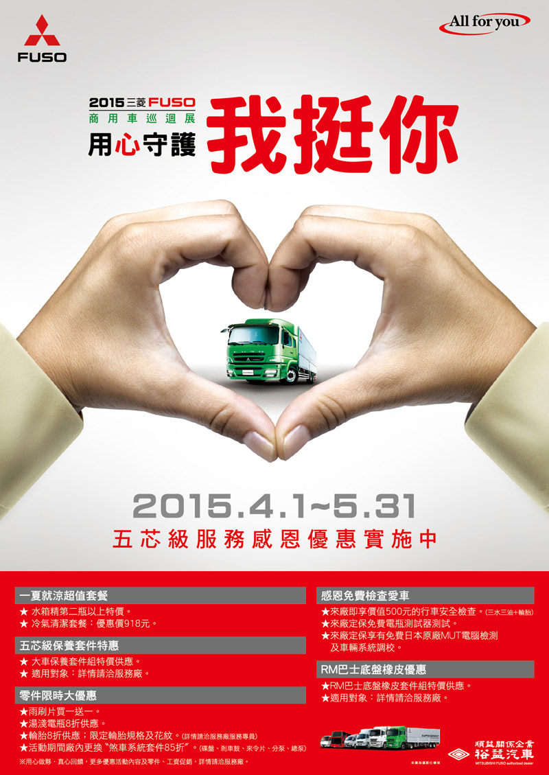 用心守護,我挺你!2015年三菱FUSO商用車巡迴展,五芯級服務感恩優惠實施中!(2015年4月1日至5月31日止)