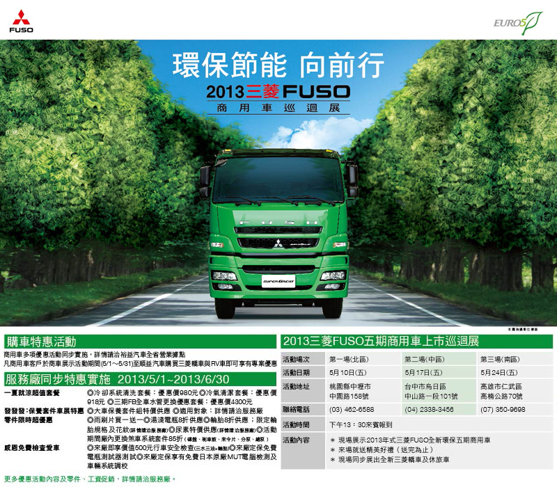 環保節能,向前行!2013年三菱FUSO五期商用車上市巡迴展!(5/10中壢、5/17台中、5/24高雄)。