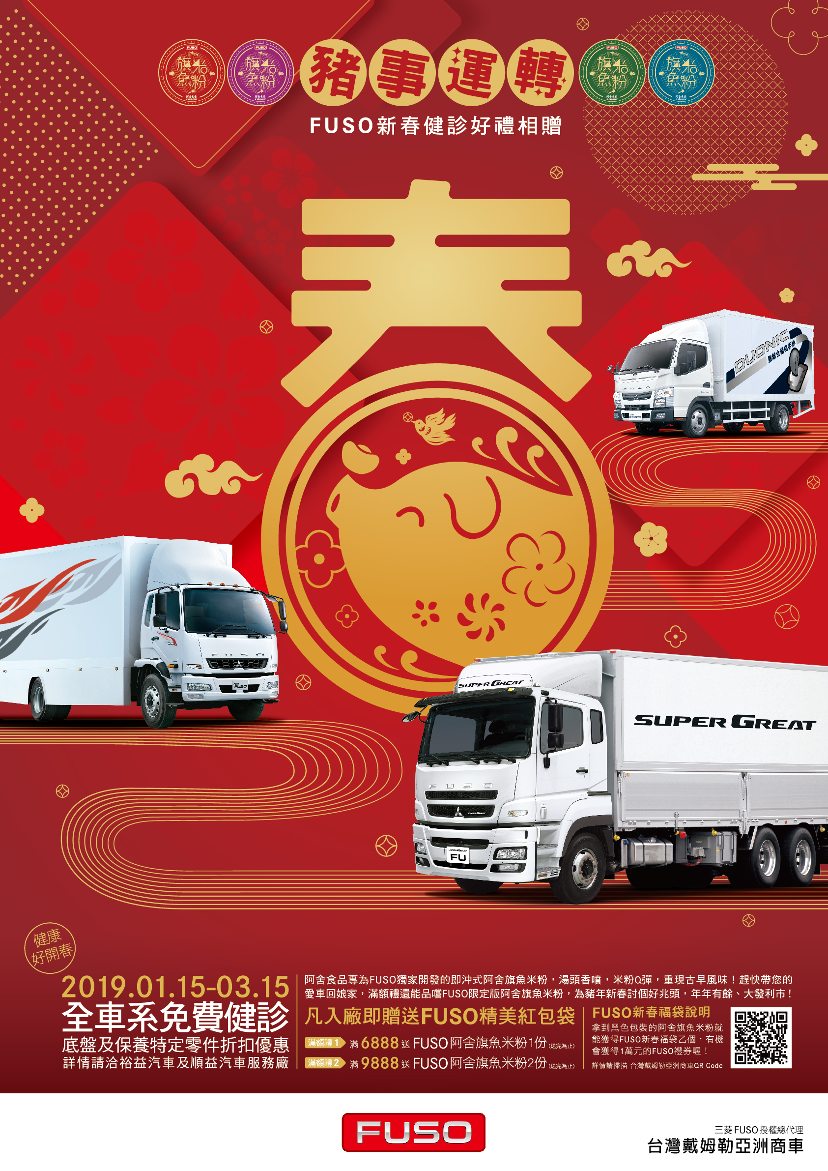 台灣戴姆勒亞洲商車(DTAT)與順益關係企業旗下的裕益汽車及順益汽車,自1月15日至3月15日在全台服務廠舉辦FUSO商用車新春全車系免費健診活動,凡入廠即贈送FUSO精美紅包袋,並享有底盤及保養特定零件折扣優惠,消費滿額6, 888元及9, 888元即可獲得FUSO獨家阿舍旗魚米粉1至2份(送完為止),拿到黑色隱藏版包裝的阿舍旗魚米粉,再獲得FUSO新春福袋乙個,內含多項FUSO精美禮品,有機會拿到最大獎項FUSO禮券1萬元!名額有限,現在就趕快帶著您的愛車,至全台裕益汽車及順益汽車服務廠參加免費健診,保養愛車還能轉動好運!
