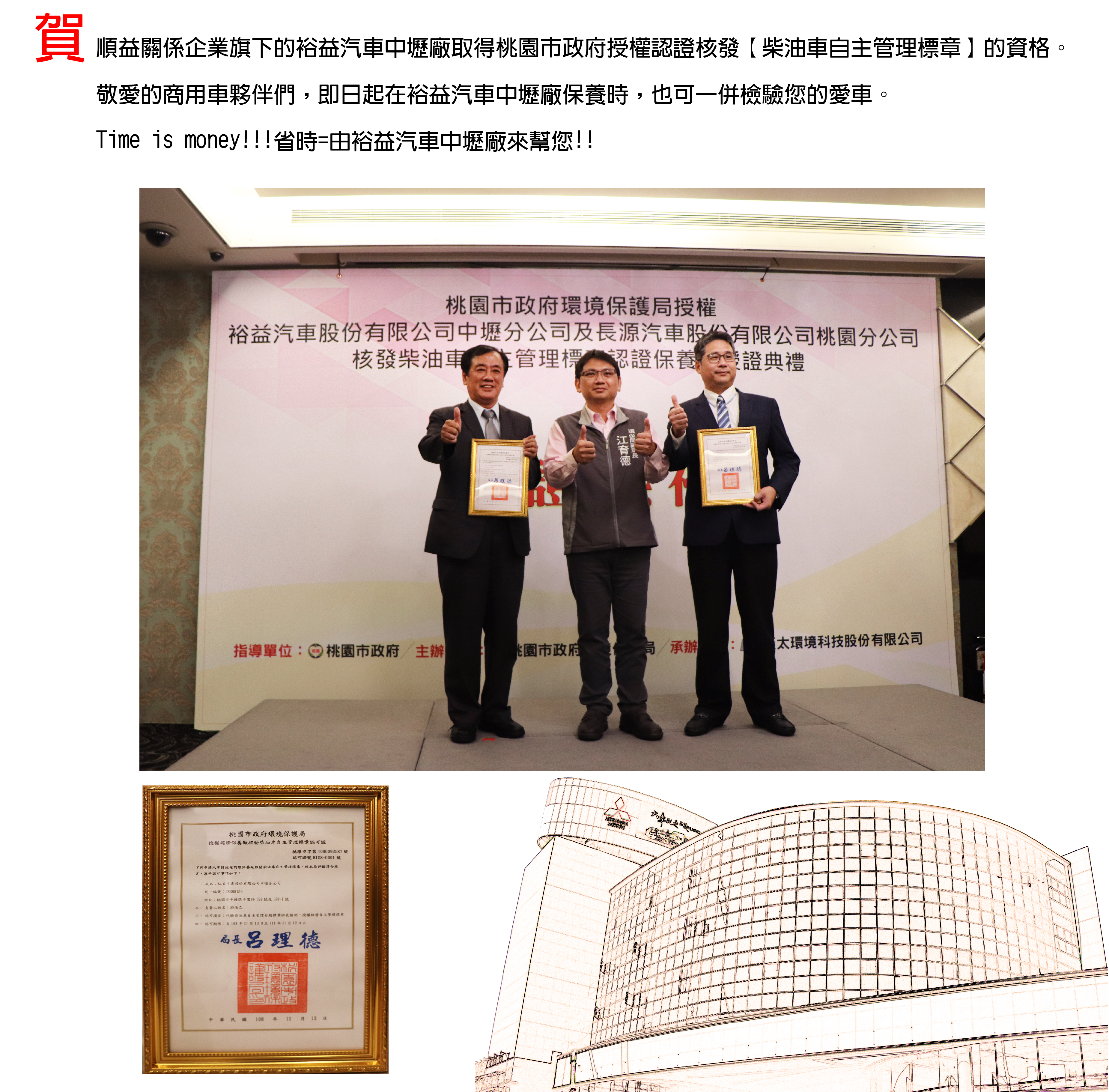 裕益汽車中壢廠取得桃園市政府授權認證核發柴油車自主管理標章的資格
