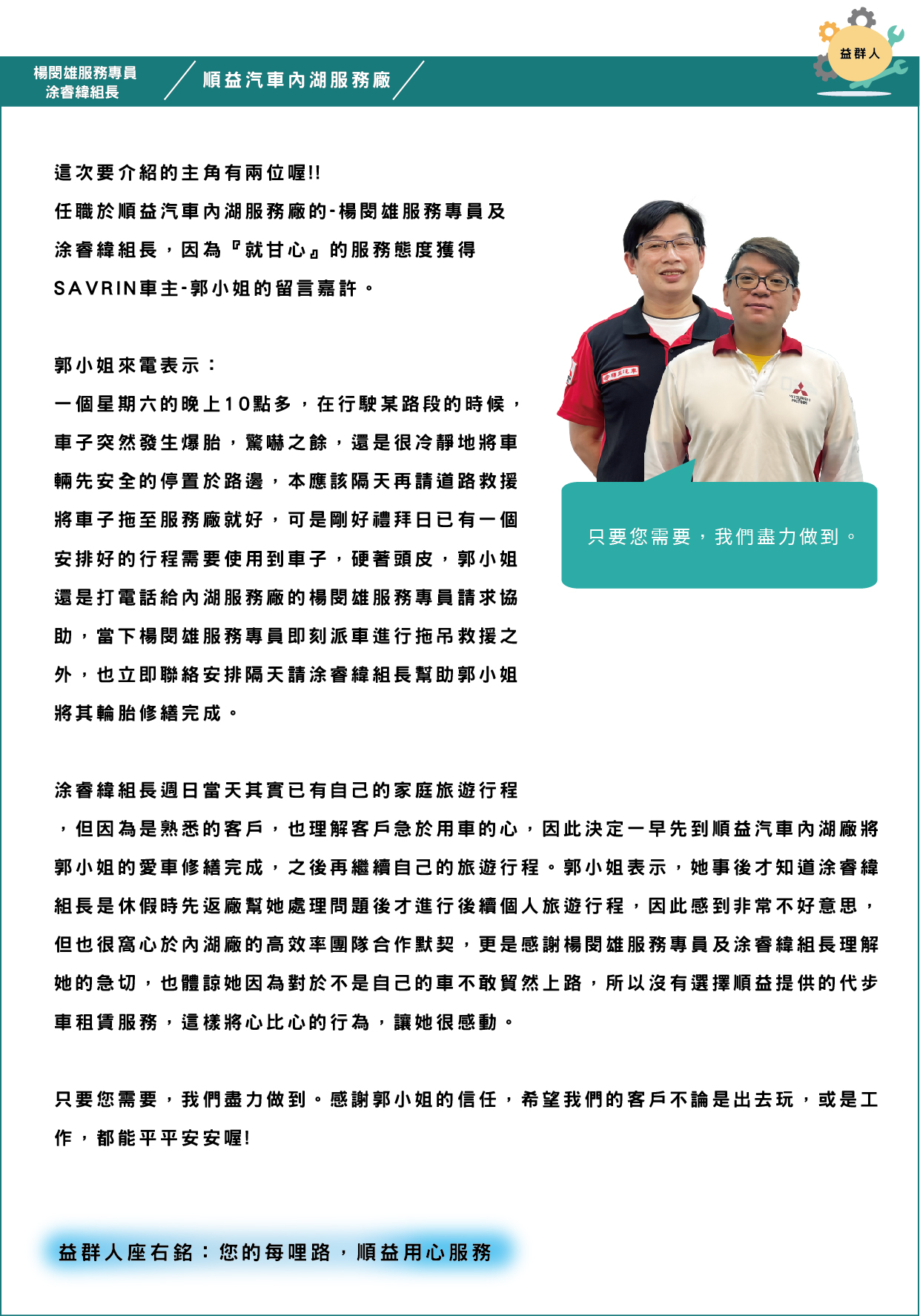 客戶推薦-順益汽車內湖服務廠-楊閔雄服務專員及涂睿緯組長